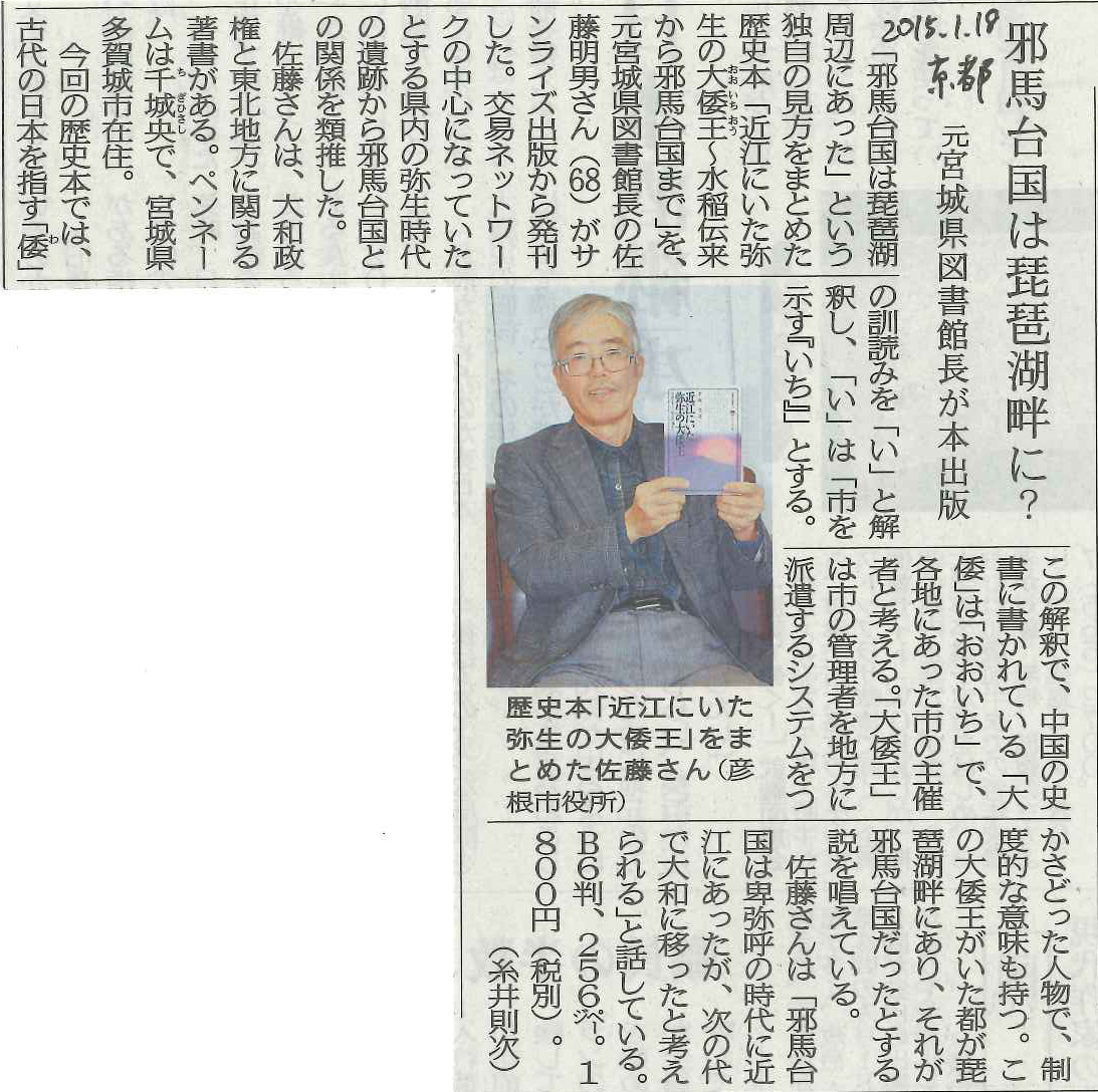 「邪馬台国は琵琶湖周辺にあった」という独自の見方をまとめた歴史本「近江にいた弥生の大倭王~水稲伝来から邪馬台国まで」を、元宮城県図書館長の佐藤明男さん(68)がサンライズ出版から発刊した。交易ネットワークの中心になっていたとする県内の弥生時代の遺跡から邪馬台国との関係を類推した。(京都新聞2015/01/18)