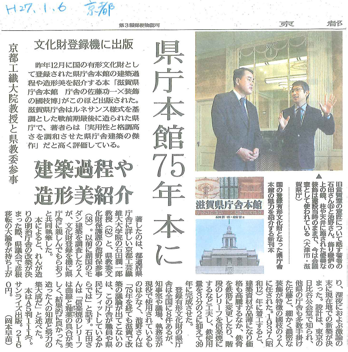 昨年12月に国の有形文化財として登録された県庁舎本館の建築過程や造形美を紹介する本「滋賀県庁舎本館 庁舎の佐藤功一×装飾の國枝博」がこのほど出版された。滋賀県庁舎はルネサンス様式を基調とした戦前期最後に造られた県庁で、著者らは「実用性と格調高さを調和させた県庁舎建築の傑作」だと高く評価している。(京都新聞2015/01/06)