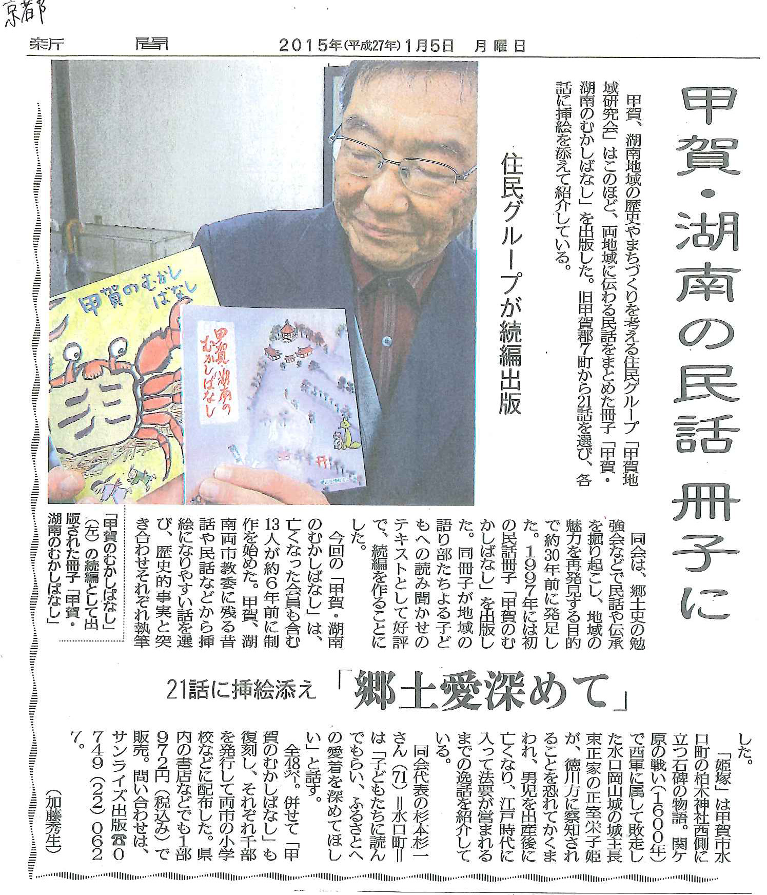 甲賀、湖南地域の歴史やまちづくりを考えるグループ「甲賀地域研究会」はこのほど、両地域に伝わる民話をまとめた冊子「甲賀・湖南のむかしばなし」を出版した。旧甲賀郡7町から21話を選び、各話に挿絵を添えて紹介している。(京都新聞2015/01/05)