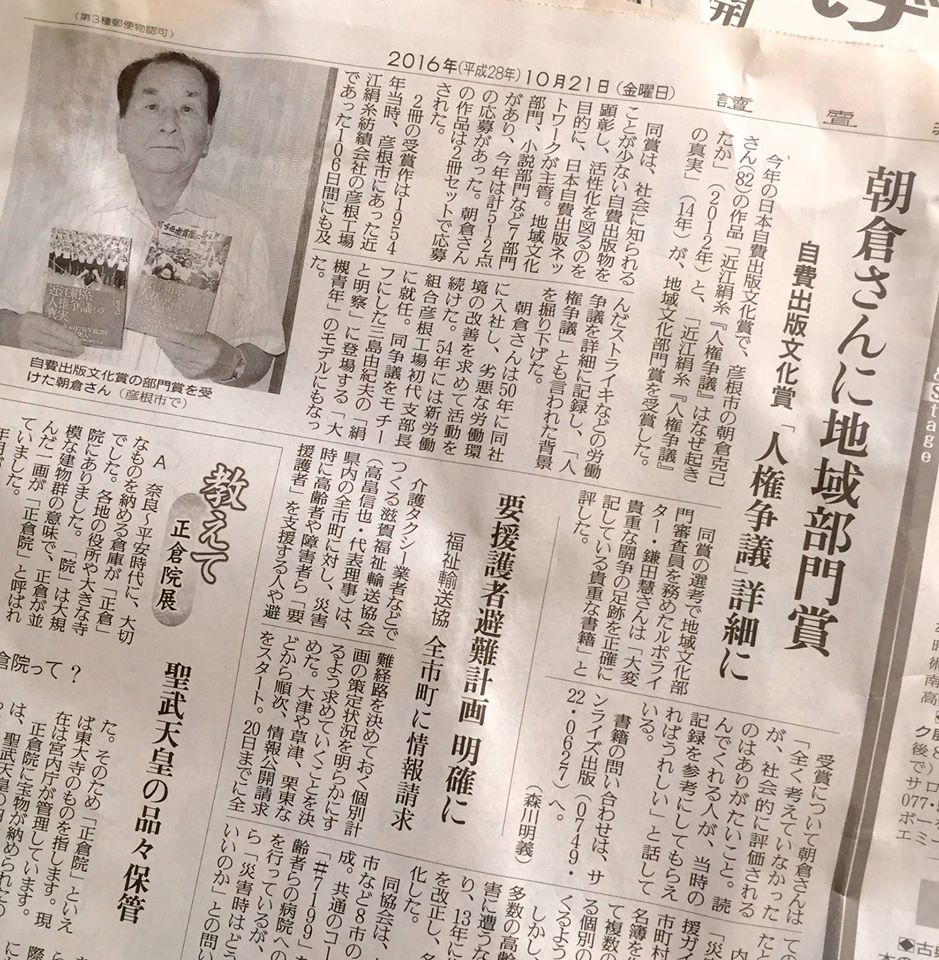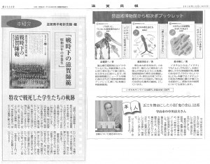 『戦時下の滋賀師範 ―昭和18年の卒業生―』(滋賀県平和祈念館編)と、琵琶湖博物館ブックレット1『ゾウがいた、ワニもいた琵琶湖のほとり』(高橋啓一著)、2『湖と川の寄生虫たち』(浦部美佐子著)、3『イタチムシの世界をのぞいてみよう』(鈴木隆仁著)、小説『鬼の念仏』(中川法夫著)が、いずれも滋賀民報の2016年10月16日付で紹介されました。