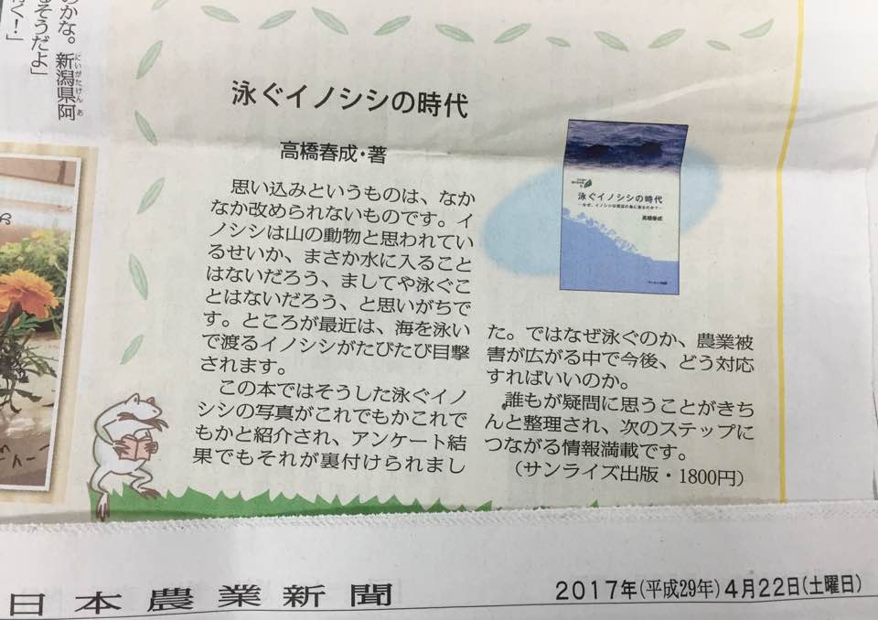 ……「新天地」を求めて、迫る波をも厭いとわない生態に迫る興味深い内容で、高橋さんは「苦もなく泳いで広範囲に移動しており、もはや山の動物ではない。人間の営みが大きな影響を与えていることも知ってもらえたら」と語る。……(読売新聞2017/04/18)