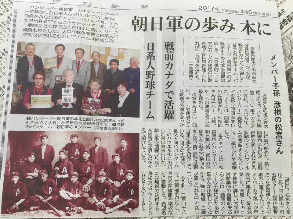 ▼朝日軍の歩み 本に/メンバー子孫 彦根の松宮さん/戦前カナダで活躍/日系人野球チーム