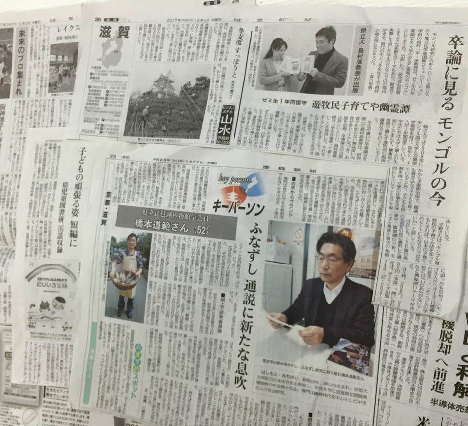 …琵琶湖の歴史や人との関わりについて研究員である大学教授や写真家らが執筆。琵琶湖博物館学芸員らの寄稿もある。約百あるという琵琶湖の湖底遺跡や、日本唯一の淡水湖の有人島である沖島(近江八幡市)の歴史、菅浦(長浜市)などでの水辺の暮らし、湖魚の食文化や漁などを写真やイラストをふんだんに使って紹介した。(中日新聞2017/12/22)