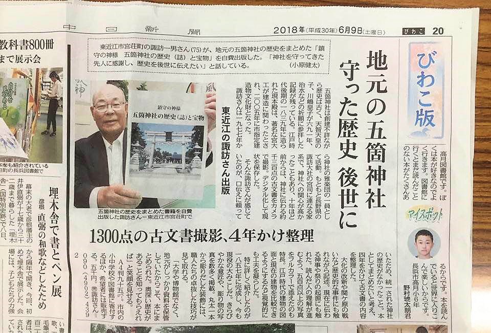 昔の大浦湊(長浜市西浅井町大浦)、片山湊(同市高月町片山)の形状や、沖島(近江八幡市沖島町)や多景島(彦根市八坂町)の歴史、戦国時代の琵琶湖で行われた鵜飼漁などを紹介。専門書のような注釈は設けず、読みやすくした。……(中日新聞2018/06/28)