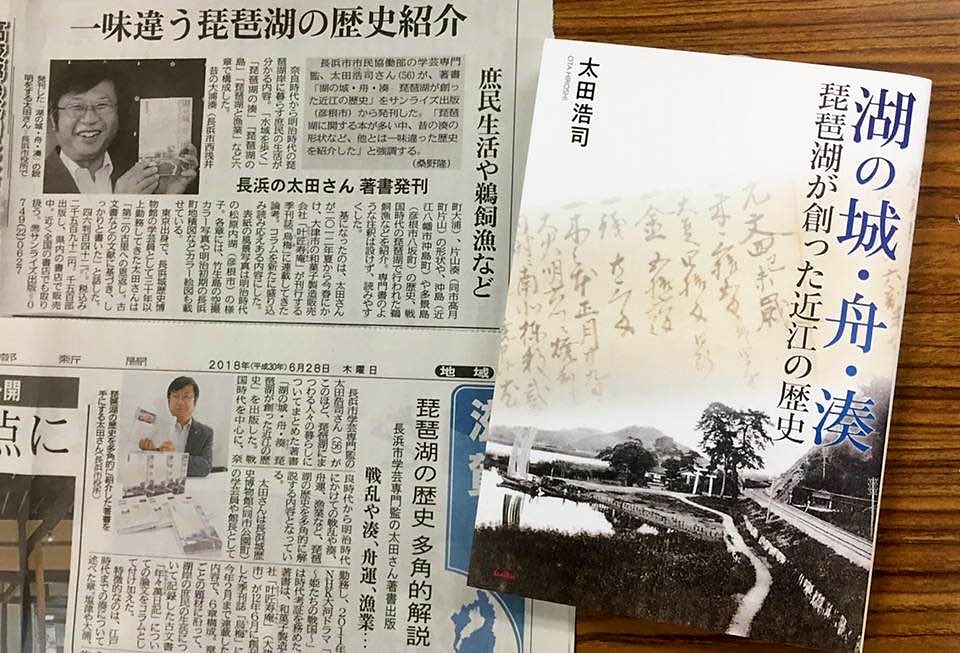 織田信長が浅井氏との戦いで用いた大船や琵琶湖周辺の発展を支えた丸子船、蒸気船について触れた「舟運」、琵琶湖で中世に鵜飼漁が行われていたことについて述べた「漁業」の章もある。太田さんは「従来の環境や民俗学の視点から書かれた著作物とはひと味違う、文献に基ずく歴史的叙述となるよう心掛けた」と話す。……(京都新聞2018/06/28)