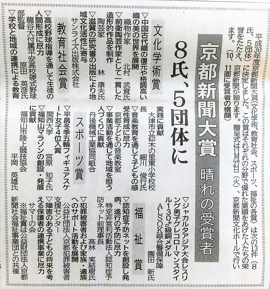 平成30年度京都新聞大賞を受賞しました