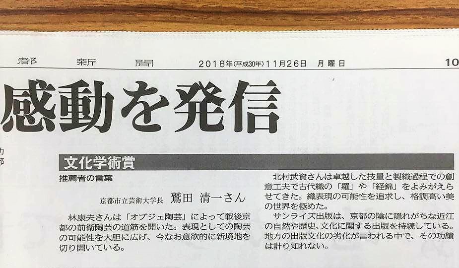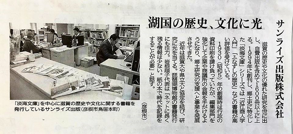 サンライズ出版は、京都の陰に隠れがちな近江の自然や歴史、文化に関する出版を持続している。地方の出版文化の劣化が言われる中で、その功績は計り知れない。(京都新聞2018/11/26)