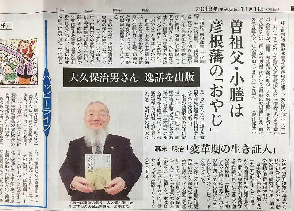 大久保治男著『幕末彦根藩の側役 大久保小膳』が中日新聞で紹介されました。 ▼曽祖父・小膳は彦根藩の「おやじ」/大久保治男さん 逸話を出版/幕末―明治「変革期の生き証人」 ……桜田門外の変で暗殺された直弼に幕府が批判を向け、藩から直弼に関わる公文書や外交に関する重要文書の焼却を命じられると、小膳は極秘で自宅に持ち帰って保管した。見つかったら自爆する覚悟で部屋に爆弾を仕掛けていたという逸話もある。……(中日新聞2018/11/01)