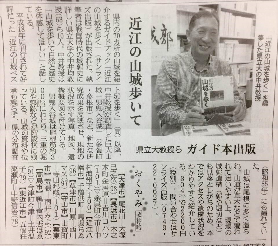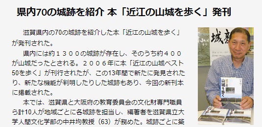 ▼県内70の城跡を紹介 本「近江の山城を歩く」発刊 滋賀県内の70の城跡を紹介した本「近江の山城を歩く」が発刊された。 県内には約1300の城跡が存在し、そのうち約400が山城だったとされる。2006年に本「近江の山城ベスト50を歩く」が刊行されたが、この13年間で新たに発見されたり、新たな機能が判明したりした城跡もあり、今回の新刊本に掲載された。……(滋賀彦根新聞2019/06/05)