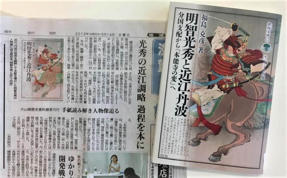 ……多くの歴史ファンから関心を集める「光秀はなぜ信長を裏切ったか」について、福島館長は地理的要因について言及する。光秀の支配した国は、丹波と坂本であり、都を挟んで近い距離にあった。また、信長は多くの戦に向けて主要道の整備を進めていた。この都を挟んだ土地勘と軍道整備が、本能寺の変のきっかけではなかったかと論を展開している。……(滋賀報知新聞2019/07/01)