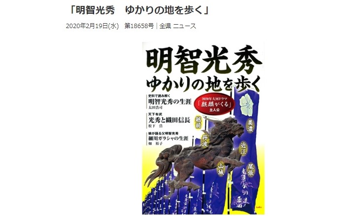 今年の大河ドラマ「麒麟がくる」の主人公・明智光秀は、前半生や人生の終焉について多くの謎が残る。そんな光秀の足跡を正確な史料に基づいてたどる書籍「明智光秀ゆかりの地を歩く」(1500円+税)が、サンライズ出版(彦根市)から好評発売中だ。