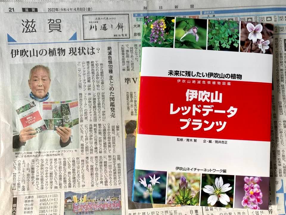 ……図鑑では伊吹山で確認されている600種余りの植物の中から、存続が心配される植物について解説し、アングルや季節を変えて数多くの写真を掲載している。企画・編集した筒井代表は図鑑の中で「今ある重要植物の種類と植生環境を植物史の記録として伝え残し、自然保全の大切さを啓発するとともに次世代への贈り物になれば」と綴っている。……(滋賀夕刊2022/04/11)