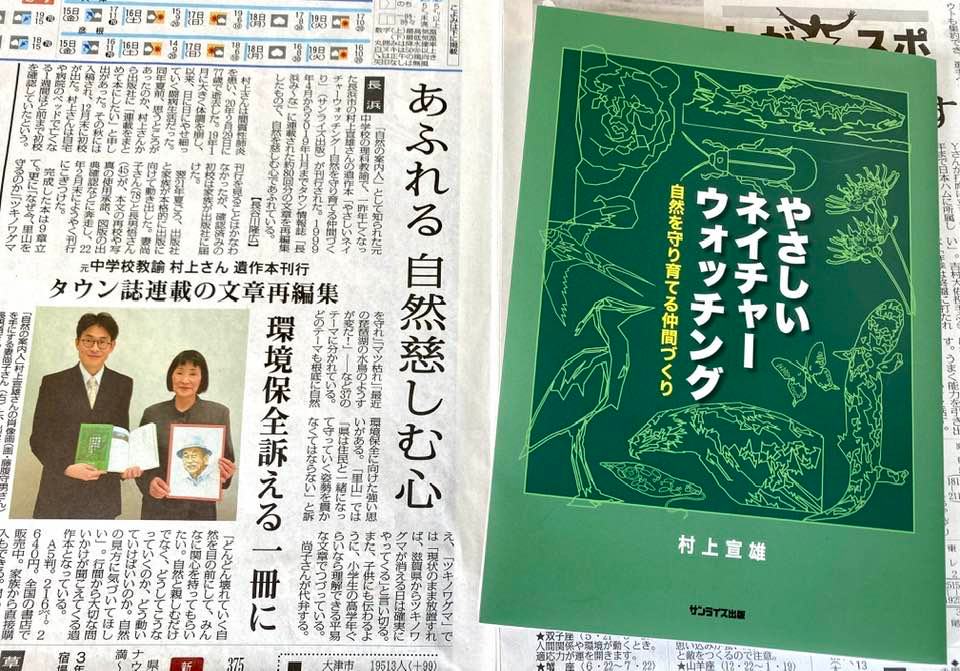 「自然の案内人」として知られた元中学校の理科教諭で、一昨年亡くなった長浜市の村上宣雄さんの遺作本「やさしいネイチャーウォッチング―自然を守り育てる仲間づくり」(サンライズ出版)が刊行された。1999年4月から2019年11月までタウン情報誌「長浜み~な」に連載された約80回分の文章を再編集したもので、自然を慈しむ心であふれている。……(毎日新聞2022/04/13)