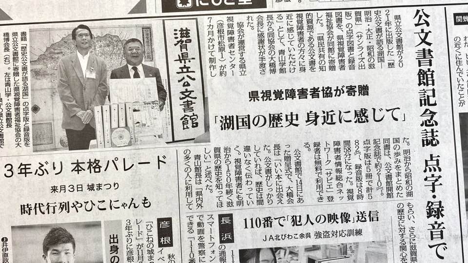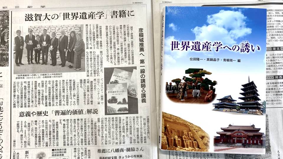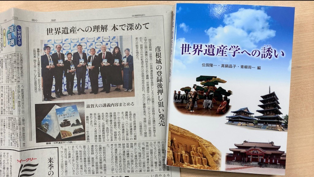 滋賀大(本部・彦根市)の「世界遺産学」講義が書籍化され、位田隆一・前学長らが彦根市役所を訪れ献本した。タイトルは「世界遺産学への誘(いざな)い」。同講義は彦根城の世界遺産化を推進する彦根商工会議所(小出英樹会頭)の寄付を元に、2019年度から市民参加型で開かれている。本を受け取った和田裕行市長と小出会頭は、「来年には国内推薦を取り、25年度に世界遺産登録を達成したい」などと意欲を語った。……(毎日新聞2022/10/29)