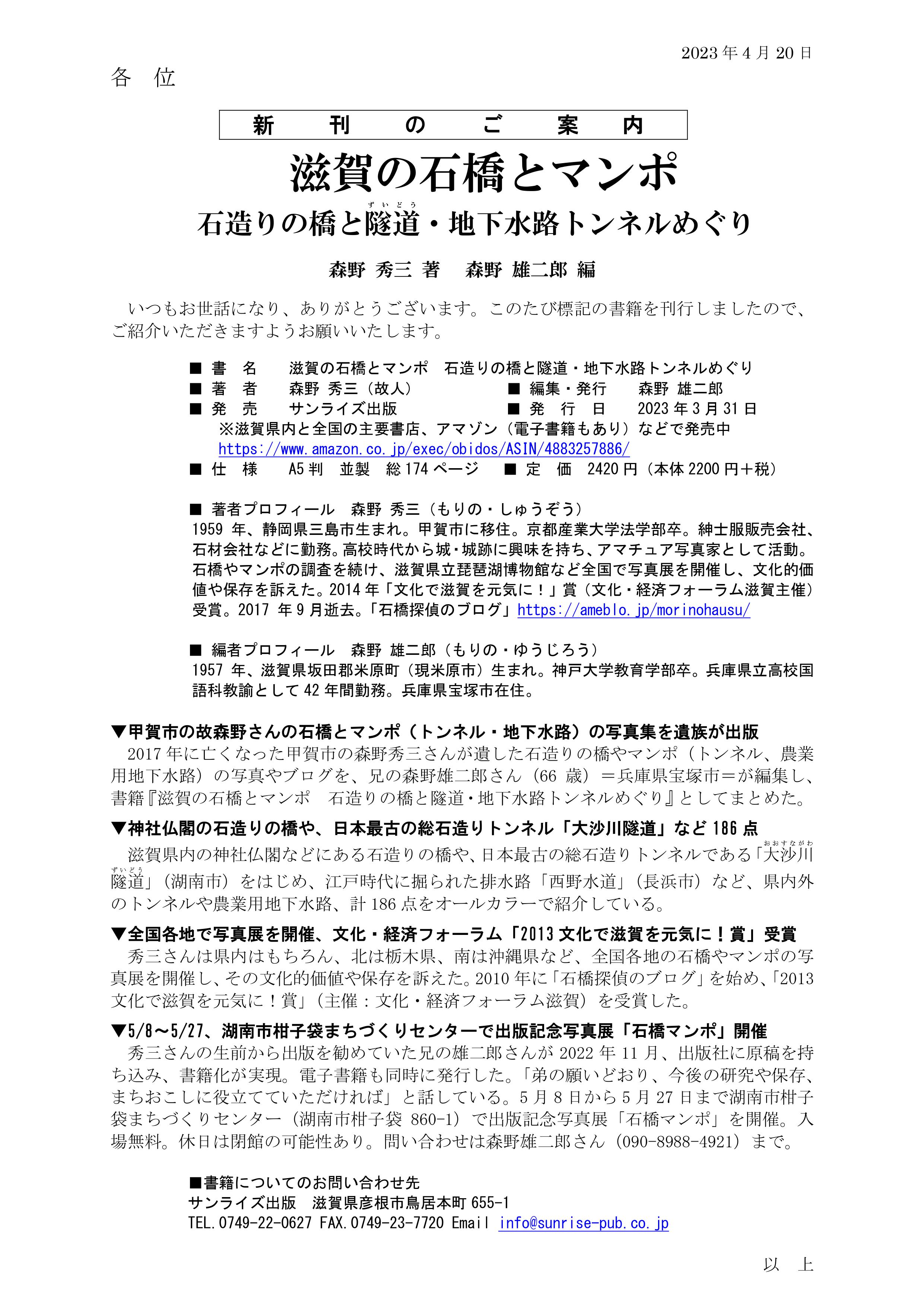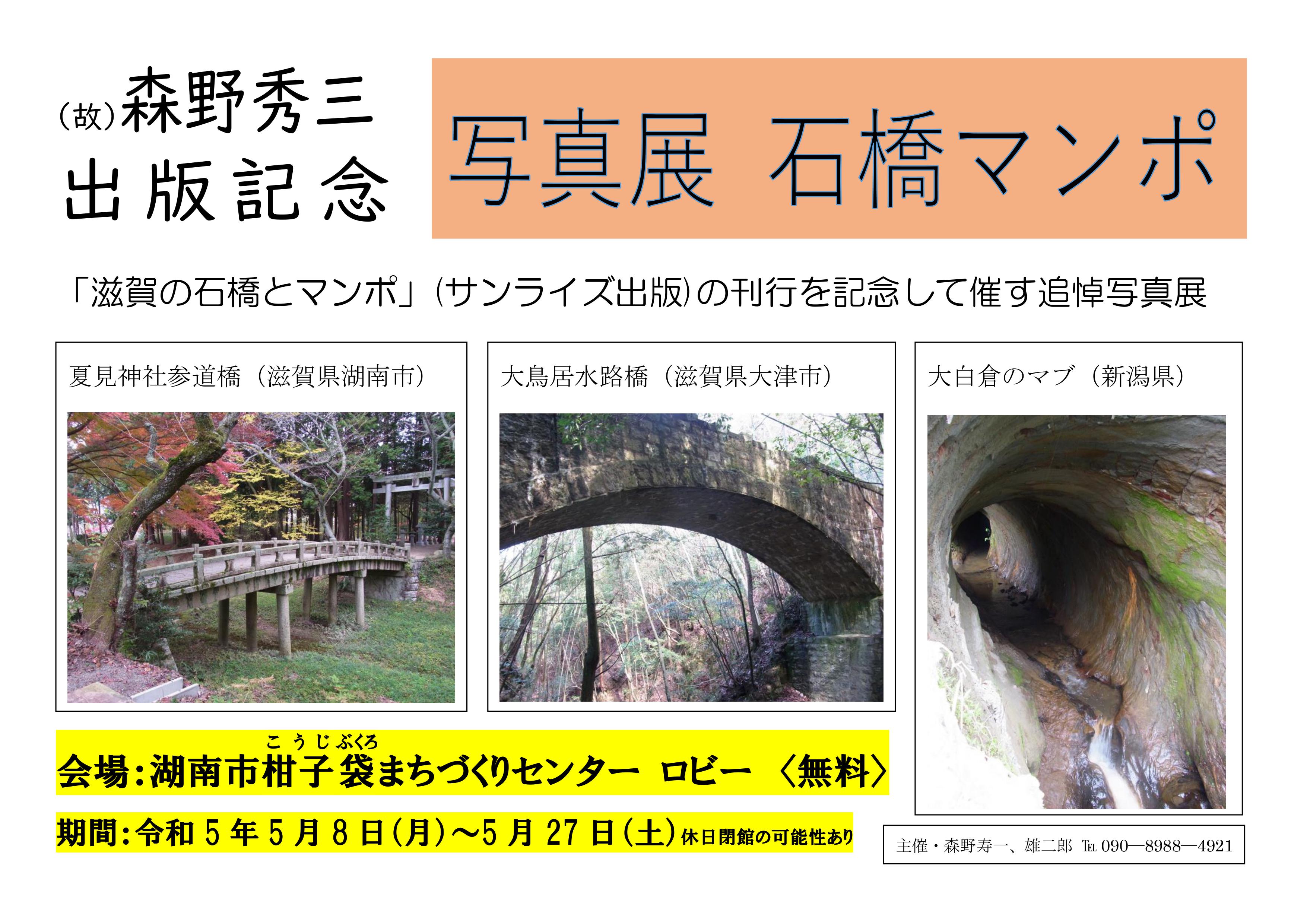 秀三さんの生前から出版を勧めていた兄の雄二郎さんが2022年11月、出版社に原稿を持ち込み、書籍化が実現。電子書籍も同時に発行した。「弟の願いどおり、今後の研究や保存、まちおこしに役立てていただければ」と話している。5月8日から5月27日まで湖南市柑子袋まちづくりセンター(湖南市柑子袋860-1)で出版記念写真展「石橋マンポ」を開催。入場無料。休日は閉館の可能性あり。問い合わせは森野雄二郎さん(090-8988-4921)まで。