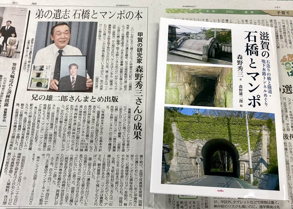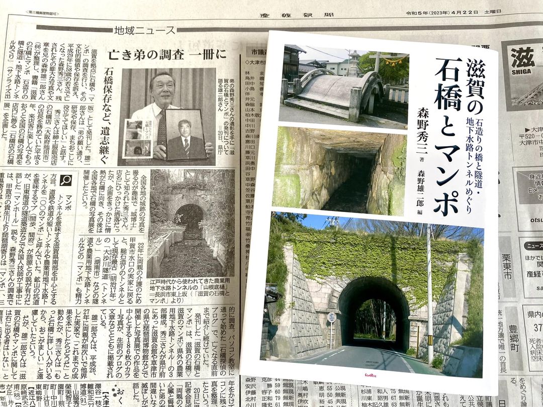 2017年に亡くなった甲賀市の森野秀三さんが遺した石造りの橋やマンポ(トンネル、農業用地下水路)の写真やブログを、兄の森野雄二郎さん(66歳)=兵庫県宝塚市=が編集し、書籍『滋賀の石橋とマンポ 石造りの橋と隧道・地下水路トンネルめぐり』としてまとめた。