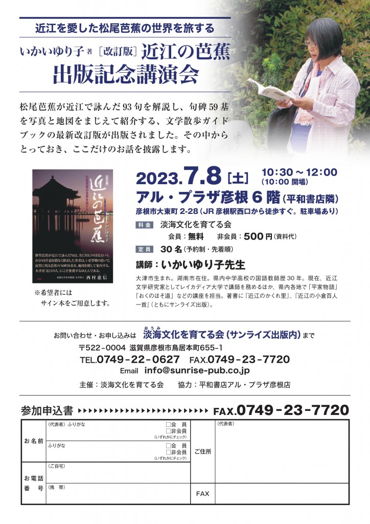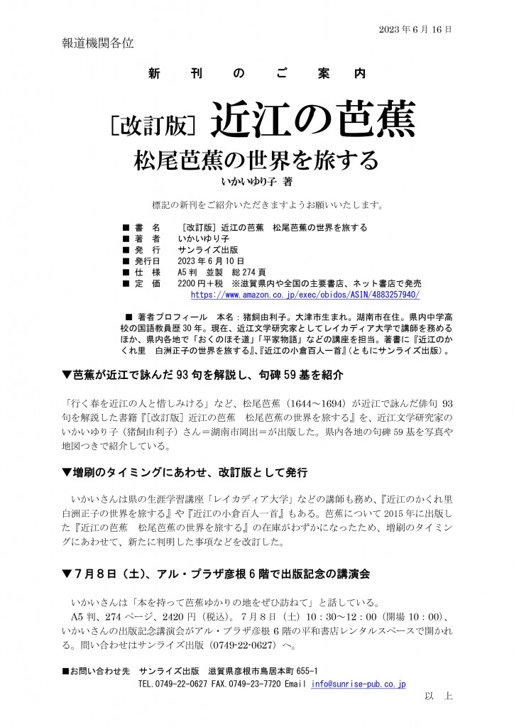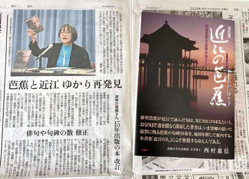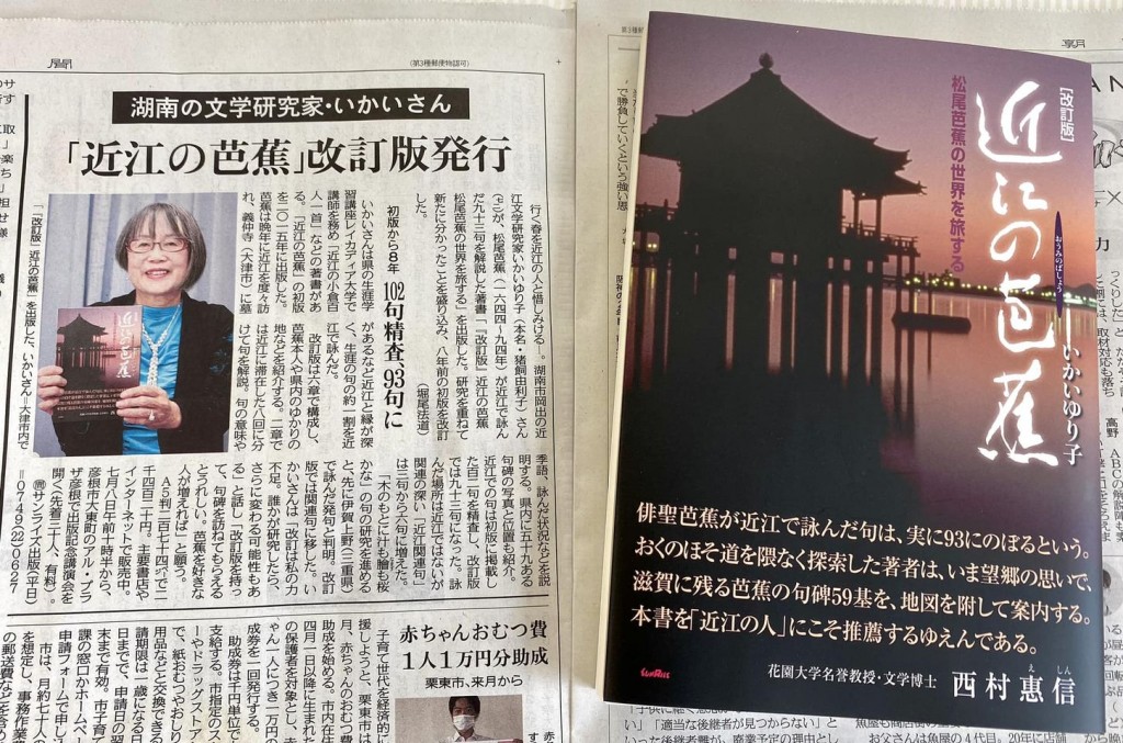 近江と縁が深い江戸時代前期の俳人・松尾芭蕉。近江にまつわる芭蕉の句を多くの人に知ってもらう著書「近江の芭蕉 松尾芭蕉の世界を旅する」(サンライズ出版)の改訂版が発行された。著者で滋賀県湖南市の近江文学研究家、いかいゆり子さん(72)は「本を手に芭蕉の句碑を訪ねて、近江を再発見してほしい」と話している。(産経新聞2023/6/30)