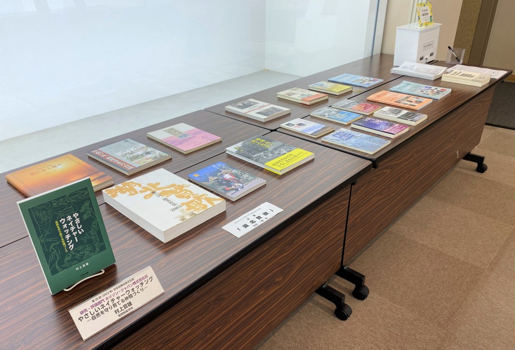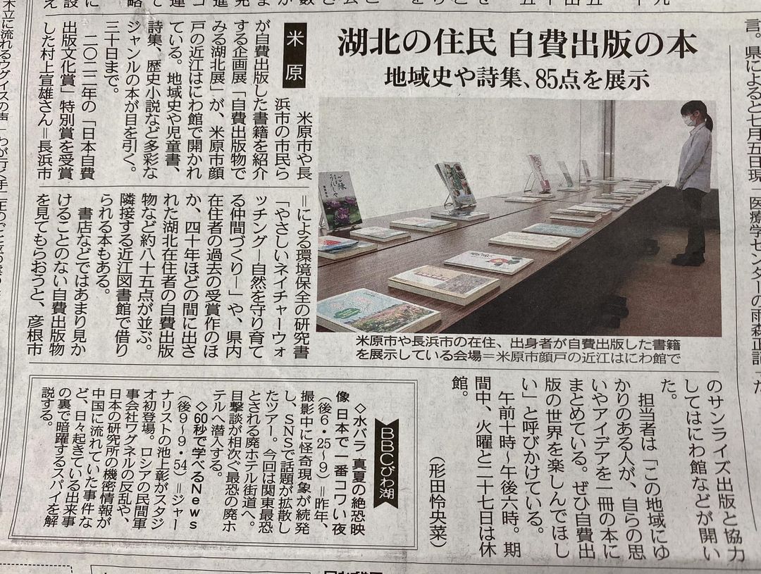 ……二〇二二年の「日本自費出版文化賞」特別賞を受賞した村上宣雄さん=長浜市=による環境保全の研究書「やさしいネイチャーウォッチング―自然を守り育てる仲間づくり―」や、県内在住者の過去の受賞作のほか、四十年ほどの間に出された湖北在住者の自費出版物など約八十五点が並ぶ。隣接する近江図書館で借りられる本もある。……(中日新聞2023/7/12)