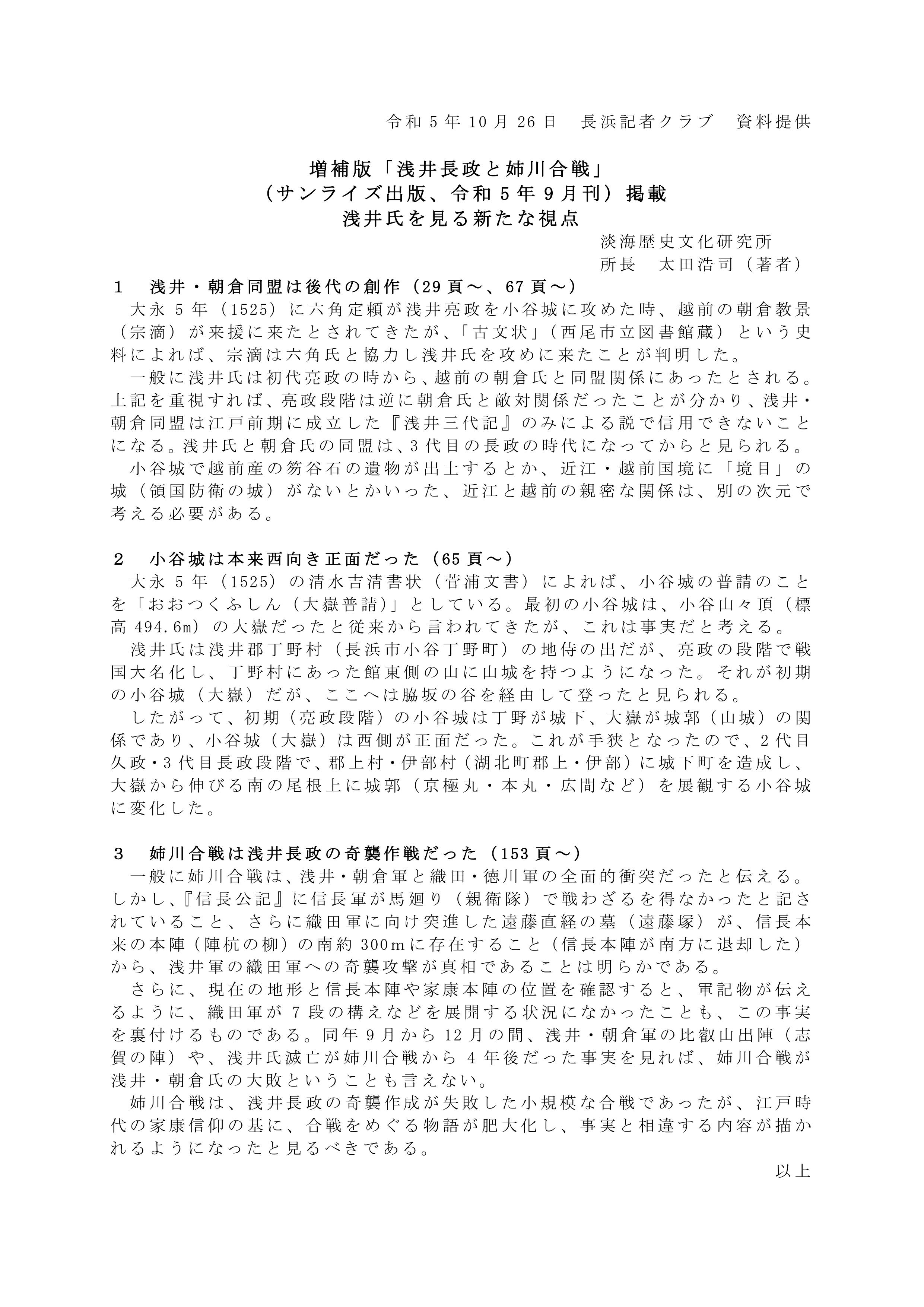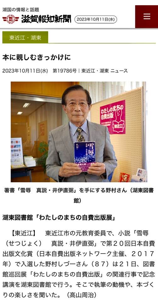 著書出版を記念した講演会が11月12日午後2時から臨湖(港町)で開かれる。太田さんが大河ドラマ「どうする家康」にもふれながら、長政と姉川合戦に関する新説などを解説する。参加費は一般500円。定員150人。申し込みはサンライズ出版☎0749-22-0627へ。(滋賀夕刊2023/10/30)
