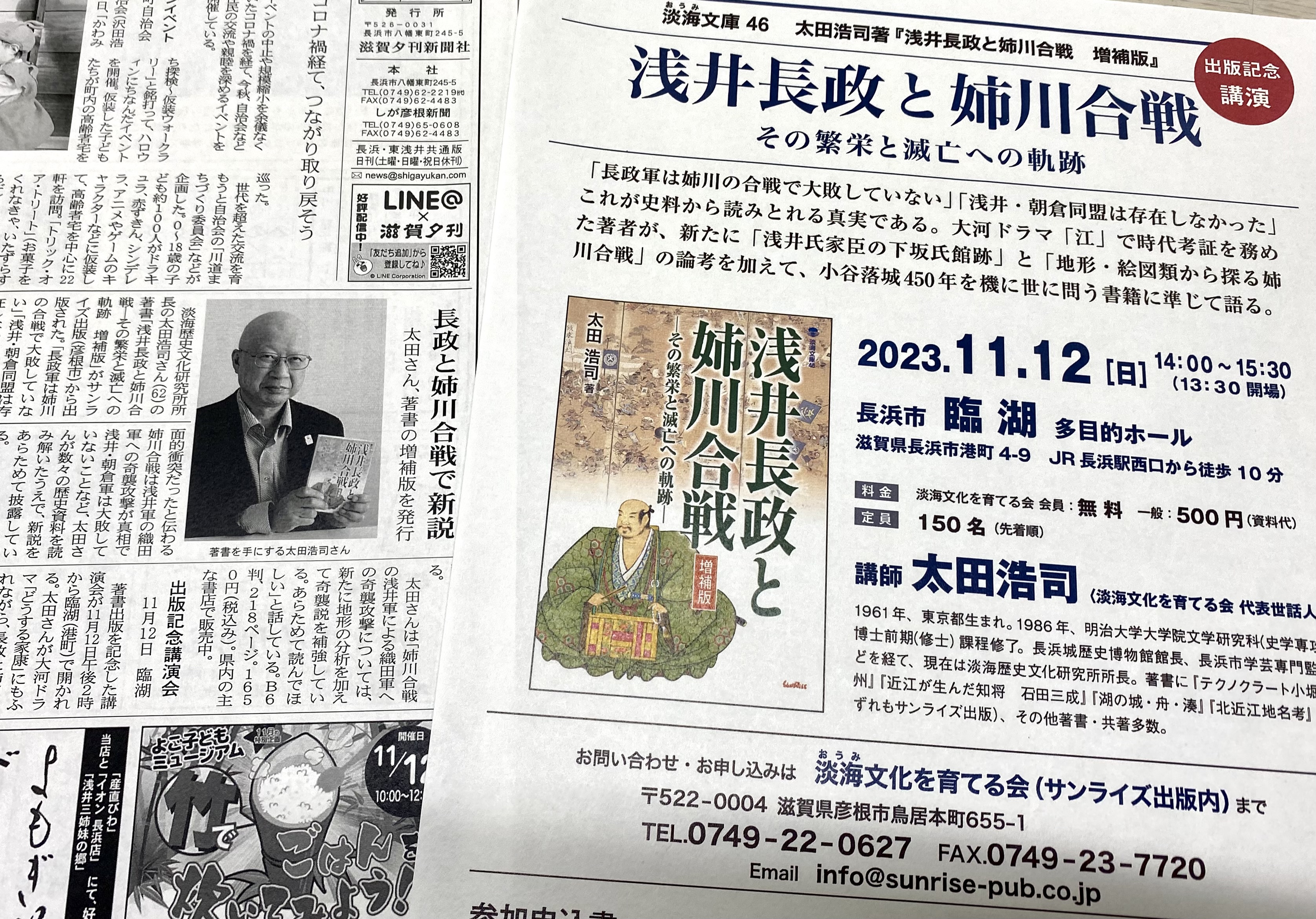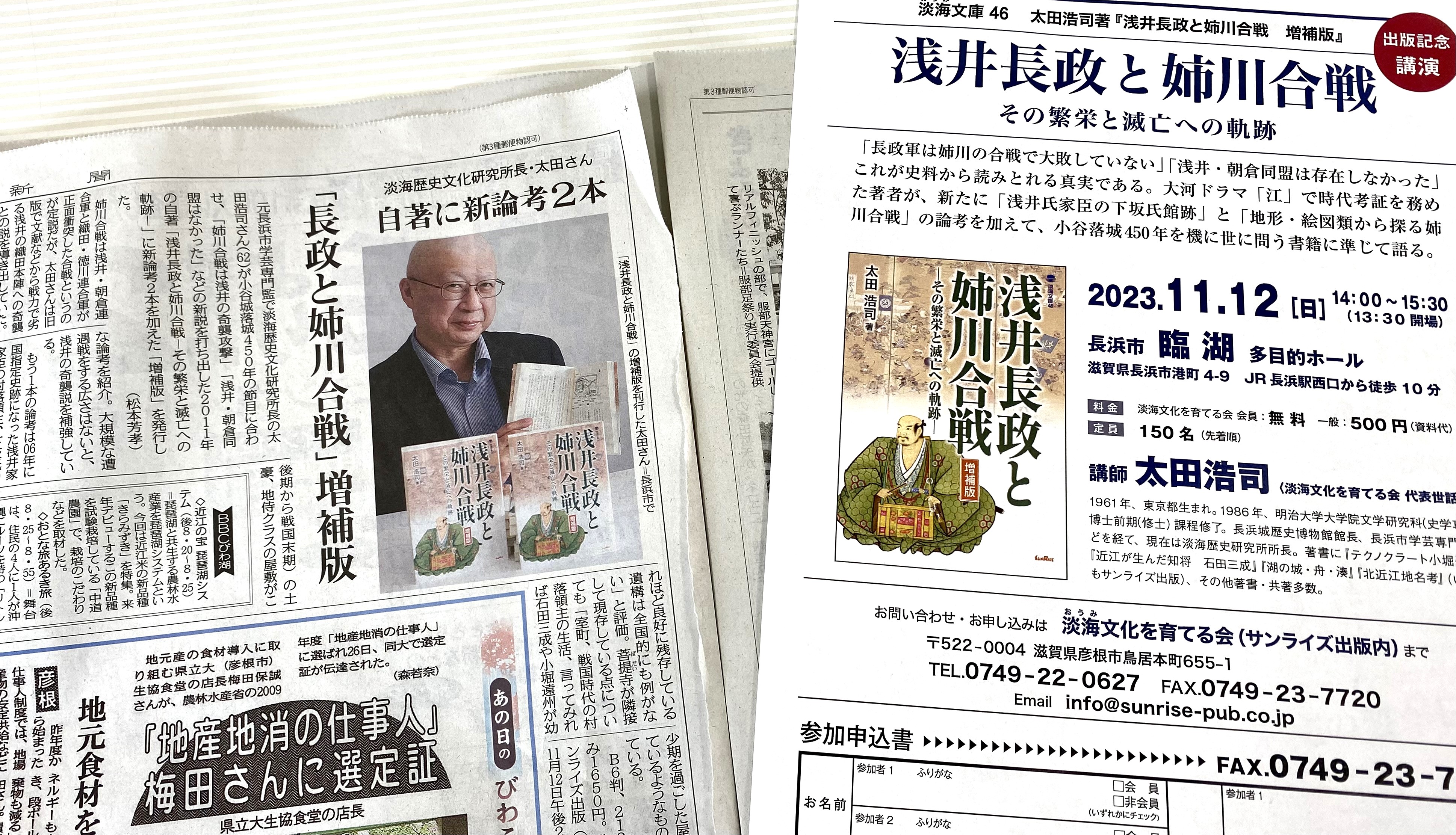 11/12(日)長浜市「臨湖」で開催する太田浩司さんの『浅井長政と姉川合戦 増補版』出版記念講演会が滋賀夕刊で紹介されました