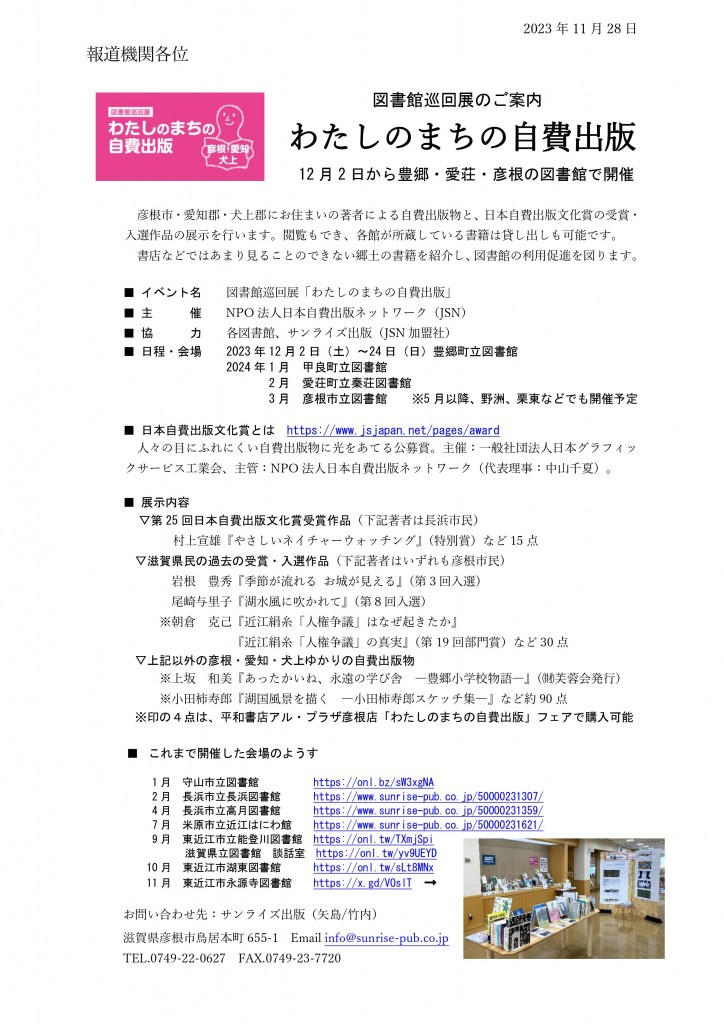 彦根市・愛知郡・犬上郡にお住まいの著者による自費出版物と、日本自費出版文化賞の受賞・入選作品の展示を行います。閲覧もでき、各館が所蔵している書籍は貸し出しも可能です。一部の書籍は平和書店アル・プラザ彦根店で購入いただけます。
