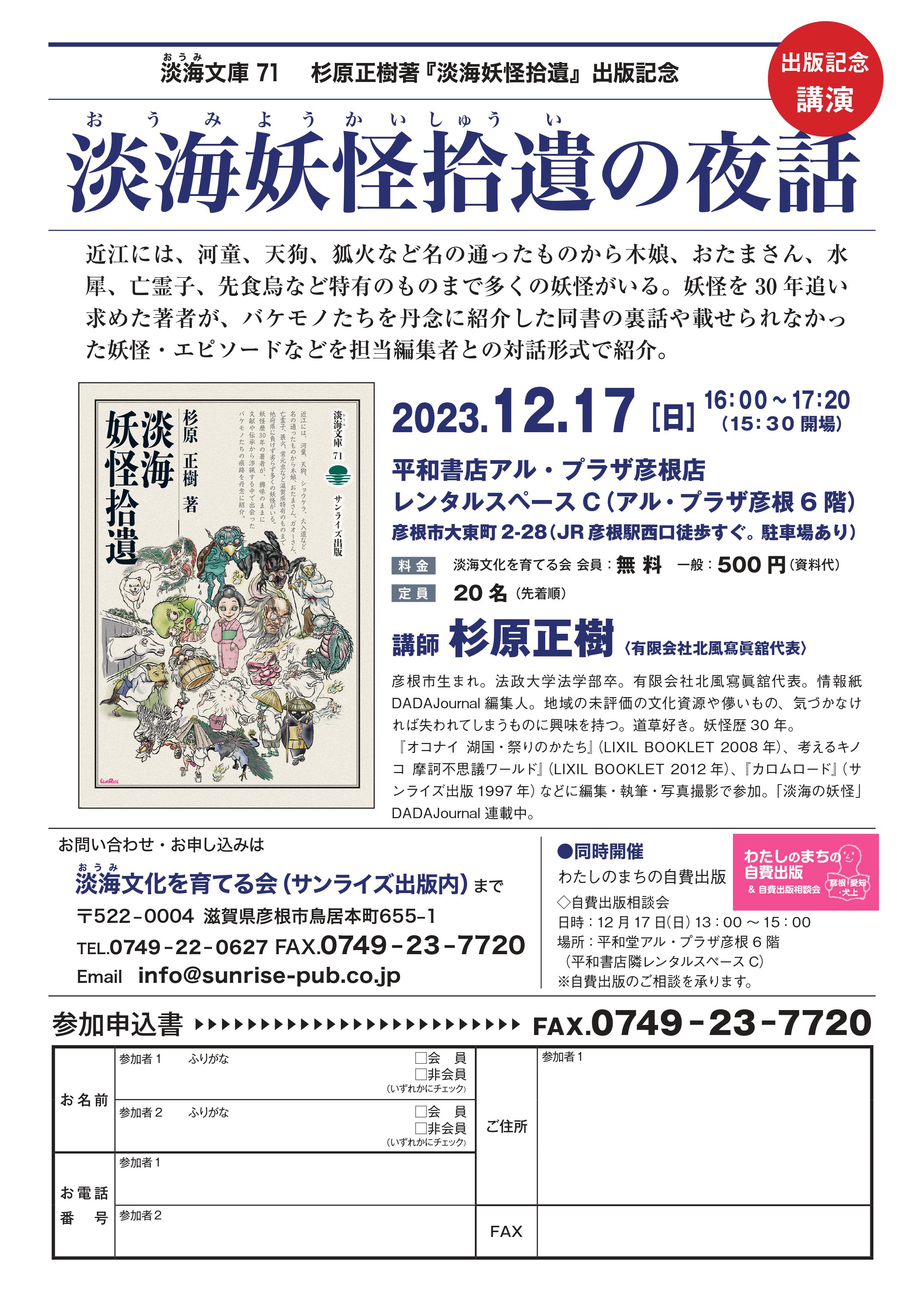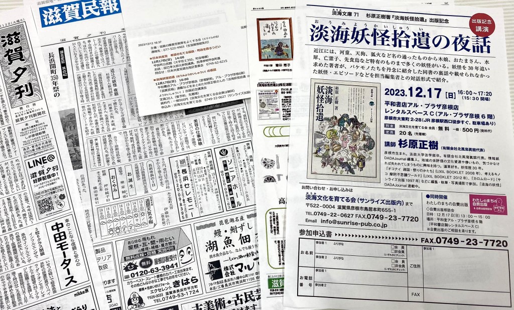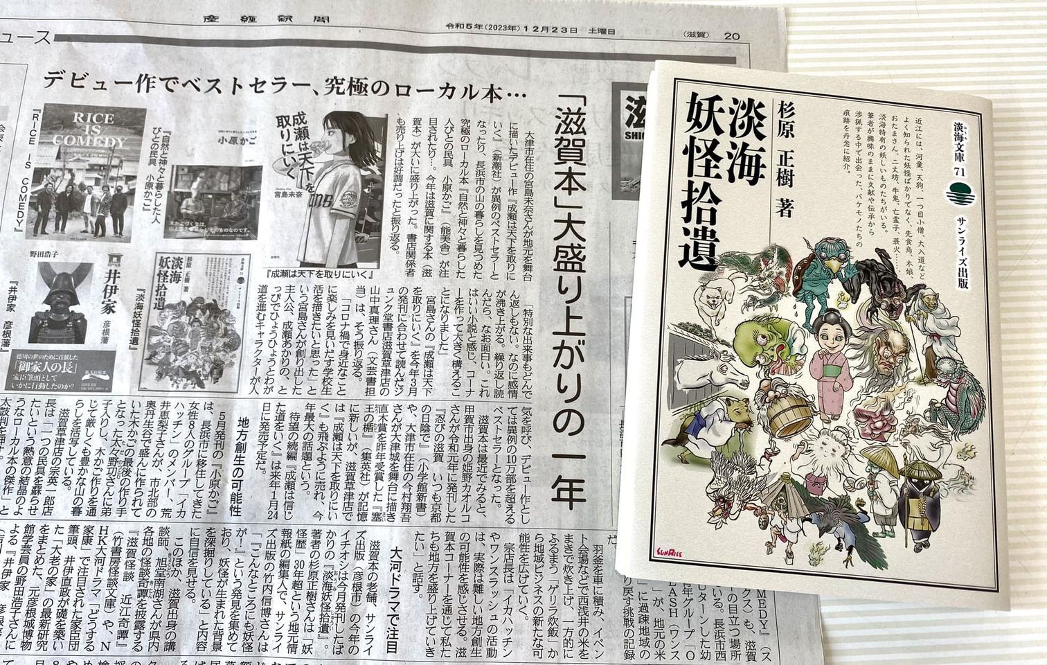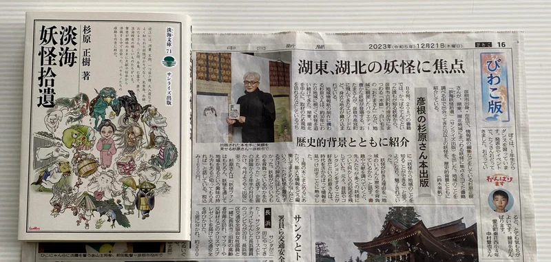 ……滋賀本の老舗、サンライズ出版(同県彦根市)の今年のイチオシは今月発刊したばかりの『淡海(おうみ)妖怪拾遺(しゅうい)』。著者の杉原正樹さんは「妖怪歴」30年超という地元情報紙の編集人で、サンライズ出版の竹内信博さんは「『こんなところにも妖怪が!』という発見を集めており、妖怪が生まれた背景を深掘りしている」と内容に自信を見せる。……(産経新聞2023/12/23)