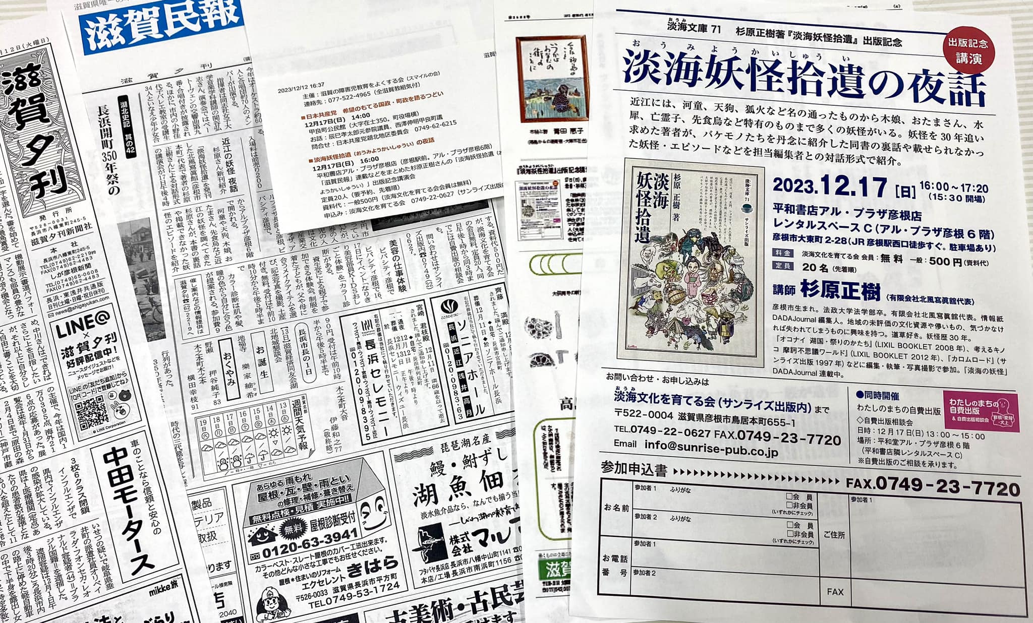 河童や天狗、木娘、おたまさん、先食烏など近江の妖怪を調べてきた杉原さんが、本書の裏話や載せられなかった妖怪のエピソードを紹介する。……同日午後1時から同3時までには自費出版の相談会も。……(滋賀夕刊2023/12/12)