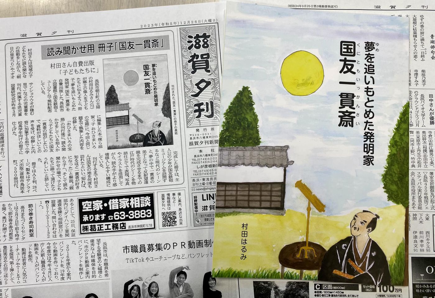長浜市朝日町の主婦の村田はるみさん(73)が郷土の偉人を子どもたちに伝えようと、冊子「夢を追いもとめた発明家 国友一貫斎」を自費出版した。長浜市立図書館と国友鉄砲ミュージアムで無料配布している。