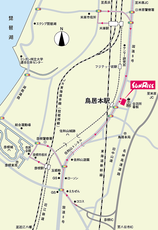 新幹線をご利用の場合 :米原駅下車 タクシーまたは近江鉄道彦根行をご利用ください。