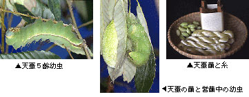 この繭は高価な緑に輝く天蚕糸の原料になります。長野県穂高地方では江戸時代の天明年間(1781~89)から天蚕の飼育が始められました。美しい光沢をもつ天蚕糸は、今も「繊維のダイヤモンド」と呼ばれて珍重されており、長浜市力丸町(旧浅井町)では1982年に浅井町天蚕組合を発足させ、天蚕繭の生産から天蚕糸を用いた加工品づくりまでの一環した事業に取り組んできましたが、現在は活動を休止しています。しかし、新たに東近江市上二俣町(旧永源寺町)でもクヌギを植栽して天蚕の大量飼育の準備を始めています。