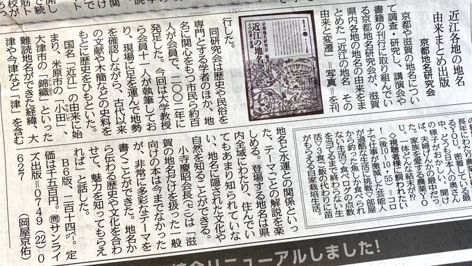 中日新聞で京都地名研究会編著『近江の地名 その由来と変遷』が再度紹介されました
