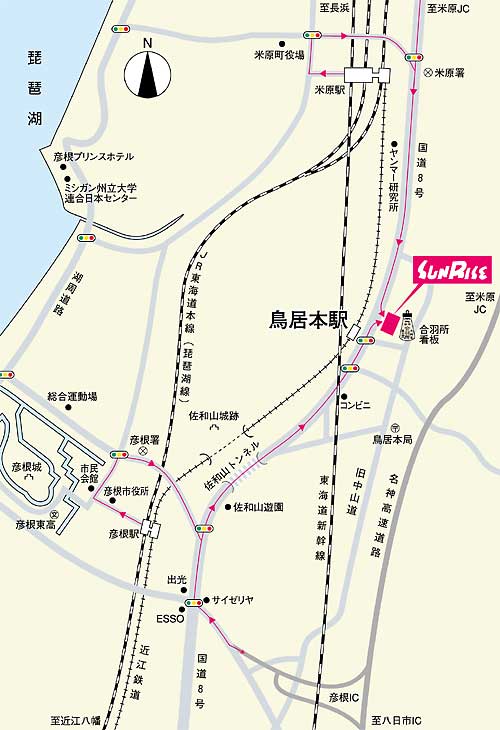 名神高速道路彦根インターチェンジよりお車で来られる場合 :10分以内です。 琵琶湖線をご利用の場合 :JR彦根駅下車 近江鉄道米原行 鳥居本駅下車 駅前です。 新幹線をご利用の場合 :米原駅下車 タクシーまたは近江鉄道彦根行をご利用下さい。