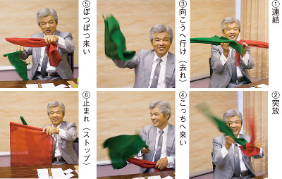 伊庭 突き放すんです。機関士が後ろから押していって自連だけぱっと切ると、離す貨車だけが向こうへ飛んでいくんですわ。貨車は駅手が乗ってサイドブレーキをかけて停車させる。そして、これは行け、去れ。「向こうへ行け」(③)です。これを振ると、「こっちへ来い」(④)。赤を横に持って、こうするのは、「ぼつぼつ来い」(⑤)です。停車位置に近づいたらあんまりどんどん来てもらったらいかんから、赤を上に持って、やるわけです。そして「ストップ」(⑥)と。
