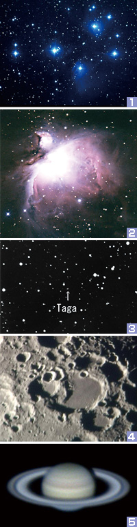 1 プレアデス星団(すばる)、2 オリオン座大星雲M42、3 天究館が発見した最初の小惑星「Taga」。2番目は「Biwako」、他に「Hikonejyo」や、「Nagahama」と名づけられたものもある、4 月面のクレーター 、5 土星(西谷輝昭氏 撮影)