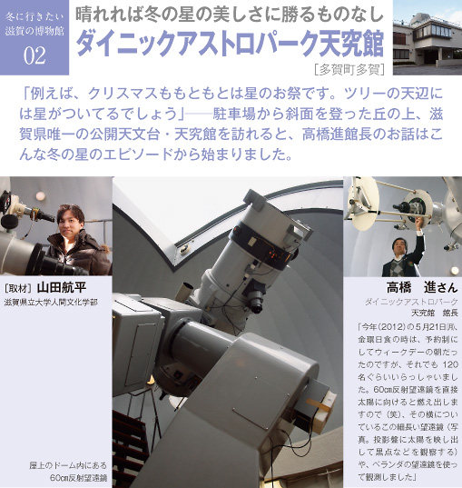住 所 犬上郡多賀町多賀283-1 連絡先 TEL 0749(48)1820 太陽観察会 毎週土曜日 午前11時~午後5時、参加費/無料 天体観望会 毎週土曜日 午後7時30分~9時30分、参加費/一般200円、小・中学生100円、幼児無料 アクセス JR彦根駅から車で15分 |