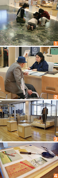 1 入ってすぐの床は滋賀県の航空写真になっており、空襲被害の場所などを確認できる、2 相談カウンター 3 秋季企画展示「八日市飛行場─飛行場があった街─」。什器は車輪付きで簡単にレイアウト変更ができる、4 同展展示の一つ、八日市みやげ「航空せんべい」