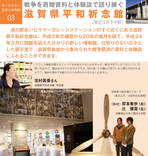 北村美香さん 全国に戦争関係の資料を扱った博物館は数多くありますが、この滋賀県平和祈念館は、滋賀県の方々の戦争体験に特化し、地域の戦争体験を次世代に語り継いでいく活動を行っています。長い準備期間の間に、寄贈いただいた資料は2万5000点を超えました。そういったモノとともに、戦争を体験された方など、約1300人の方から聞かせていただいた体験談をもとに展示を行っています。