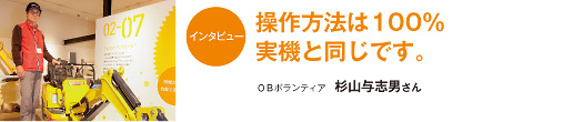 操縦コーナーの機械の操作の案内や展示の解説は、約50名のヤンマーOBが務めています。65歳の私が一番の若手ぐらい、70歳代の人が多く、最高齢は82歳です。5つのコーナーごとに10人ずつの体制で、1日2人ローテーションで館に来ています。