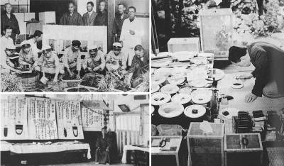 (左上)ホタルの人工孵化箱を作る愛蛍会の人たち。1932年 (左下)蛍祭りのため守山小学校の教室でホタル展示会を開いた南喜市郎。1935年 (下)自宅の研究室でホタルの人工飼育をする南喜市郎。1955年ごろ (3点とも『守山市誌 自然編』より)