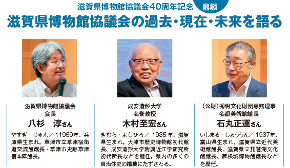 八杉(進行) 滋賀県博物館協議会は昭和57年(1982)に設立され、今年度で40周年を迎えました。この節目にあたり、記念事業委員会が、当協議会の歩みを振り返り、今後どう発展させていくかを考える、この鼎談を企画してくれました。
