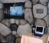▼ 中は石室コスモシアターです。号外新聞にあったように、博士は「古墳タイムマシン説」を提唱してるんですね。古墳が過去と未来をつなぐ超常エネルギーを発しているのではないかという。で、博士は実は千五百年前の古墳時代にタイムスリップしてるんです。そして過去の映像をパソコンを通じて現代に送っていると。その通信映像が画面に映し出されているんです。
