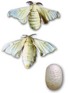 蚕の成虫(上が雄、下が雌)と蚕の繭。