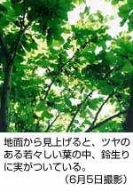 山繭の幼虫。葉の姿に擬態しているため、素人目にはどこにいるのかわからない。蚕に比べて病気や害虫に弱く、枝から逆さにぶら下がったままミイラ化しているものも多い。