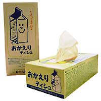 これを瀬戸内海にある工場にまで運びティッシュに再生後、再び平和堂等の売り場に帰ってくることから「おかえり」の名がつけられた。