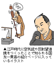 ▼例えば、国友一貫斎の業績について紹介したページのイラスト。一貫斎が空気銃につめた空気に重さがあることを確認するために、ポンプを押す回数を変えて重さを量ったという話をイラストにしてもらいました。