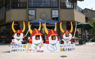 鳥居 看板を設置したのは旧八日市市が市制50周年を迎えた2004年。大凧まつり実行委員会で記念品をつくり、50市町村の連凧を揚げ、そして顔出し看板をつ くったのです。オーナー募集の案内が届いた翌日に電話をかけました。「1万円の補助が出ます」というのにだまされました(笑)。実際には一番高い看板をつ くりました。最初は穴がひとつだったのですが、ペアで顔出しできるよう、ふたつ開けてもらいました。