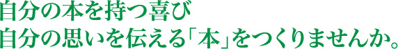 かけがいのない人生の足跡を、心の浮かんだことがらを、創作や研究の成果を、「本」はそんなあなたのメッセージを、広く永く、そして深く伝える力を持っています。自分の「本」づくりは、言わば生きざまをカタチにする作業です。 私たちはあなたのかけがえのない本づくりをお手伝いします。